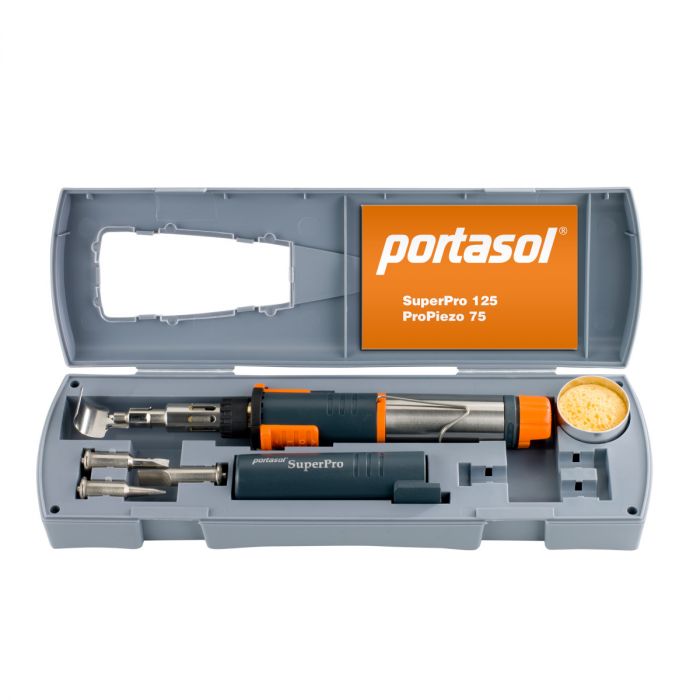 Super pro 125 soldering kit which inludes a Super pro 125 soldering iron fitted with Hot air and deflector tips, also comes with a 2.4mm DF, 4.8mm DF and hot knife tips. Cleaning sponge and tray, storage case and instructions.