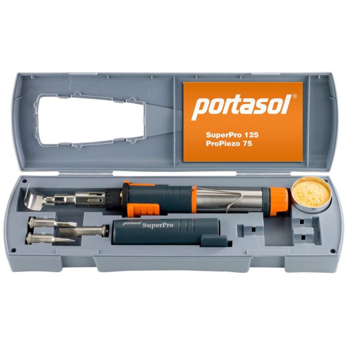 Super pro 125 soldering kit which inludes a Super pro 125 soldering iron fitted with Hot air and deflector tips, also comes with a 2.4mm DF, 4.8mm DF and hot knife tips. Cleaning sponge and tray, storage case and instructions.
